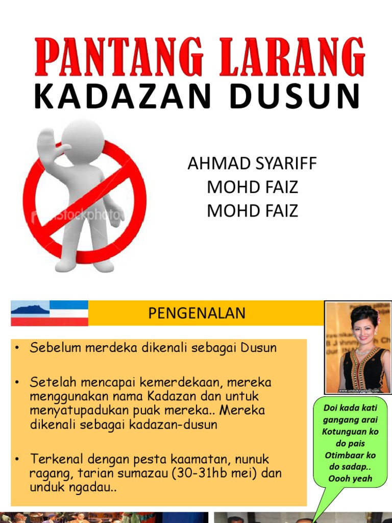 . Nanti akan terjadi ribut. PENGENALAN Kumpulan etnik terbesar di Sabah 80 Berketurunan dari pendatang Indonesia Dahulu dikenali sebagai orang Dusun Banyak amalkan unsur ritual animisme. Kaum Kadazan-Dusun juga merupakan satu kumpulan etnik dari dua bangsa iaitu Bangsa Kadazan dan Bangsa Dusun di Borneo yang digabungkan menjadi satu kumpulan kaumetnik.